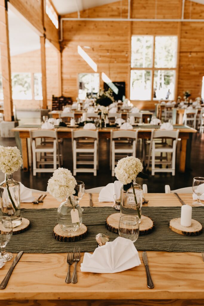 Reception setup in high-ceiling rustic dinning hall