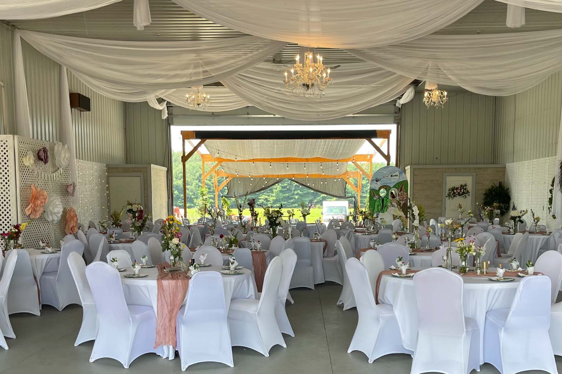 Northfork Farms offers a beautiful country setting with a modern flare. Our 4,800 square foot reception facility will give that perfect country setting while providing a modern twist. Reception facilities include a prep catering kitchen, restroom facilities, reception hall, cocktail pavilion with large outdoor patio, and outdoor firepit. Your package will include tables, chairs, facilities, and optional chair covers if you wish to enhance your event.